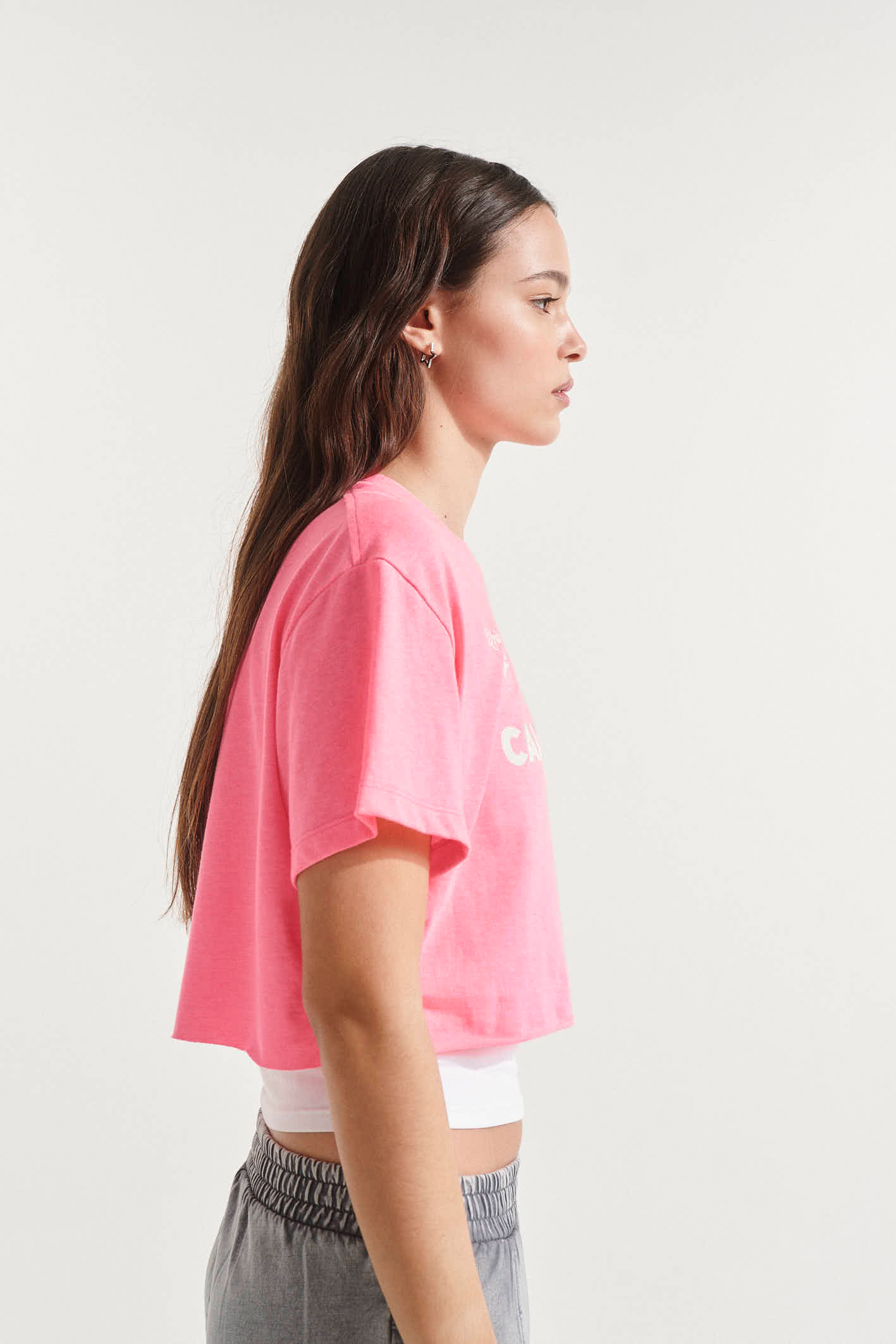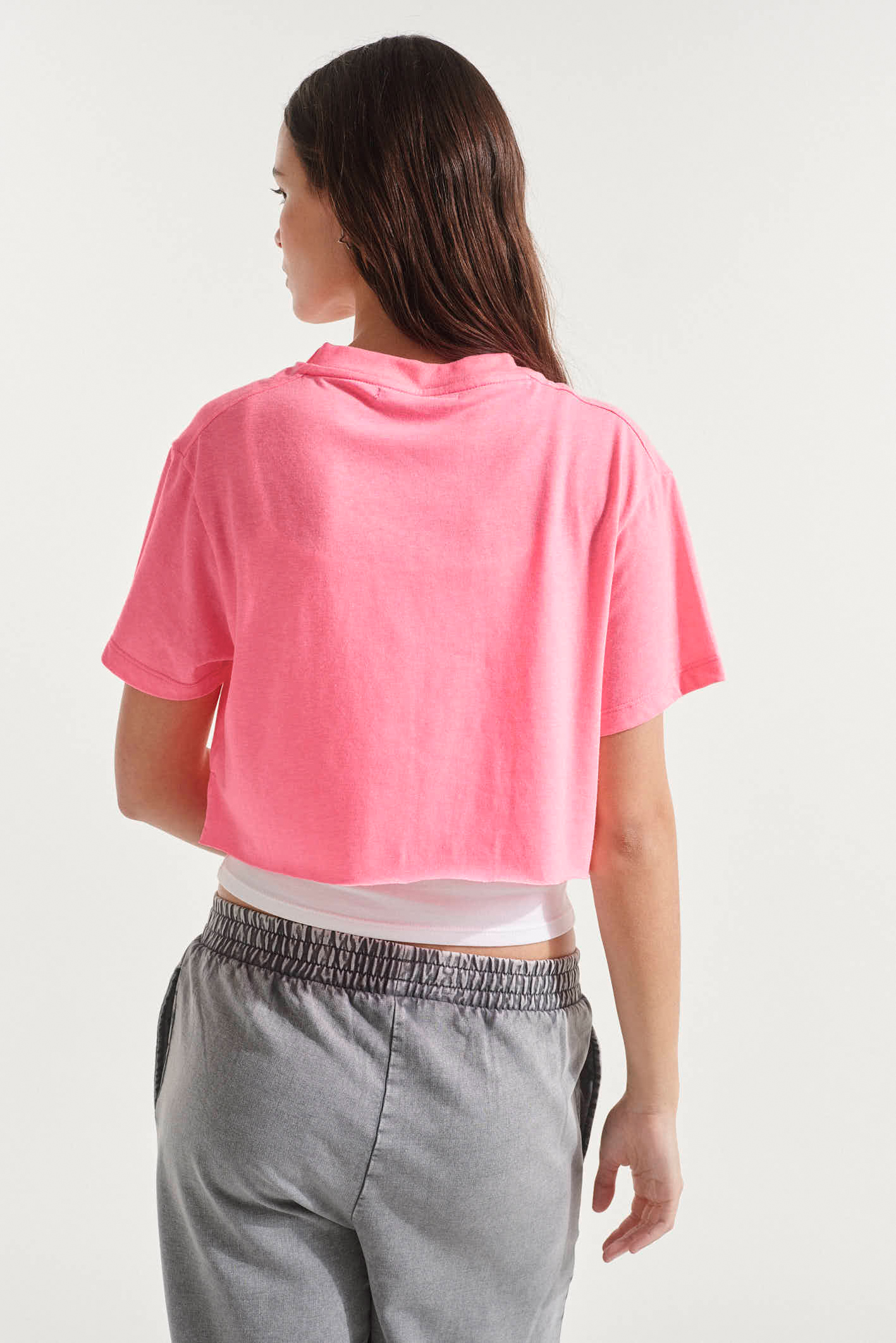 Descubre la REMERA MALENA, una fresca y cómoda remera de manga corta ideal para adolescentes. Confeccionada en un suave jersey de 65% algodón y 35% poliéster, esta prenda rosa chicle cuenta con un elegante cuello de ribb, terminación al corte y aberturas laterales, perfecta para lucir en verano.