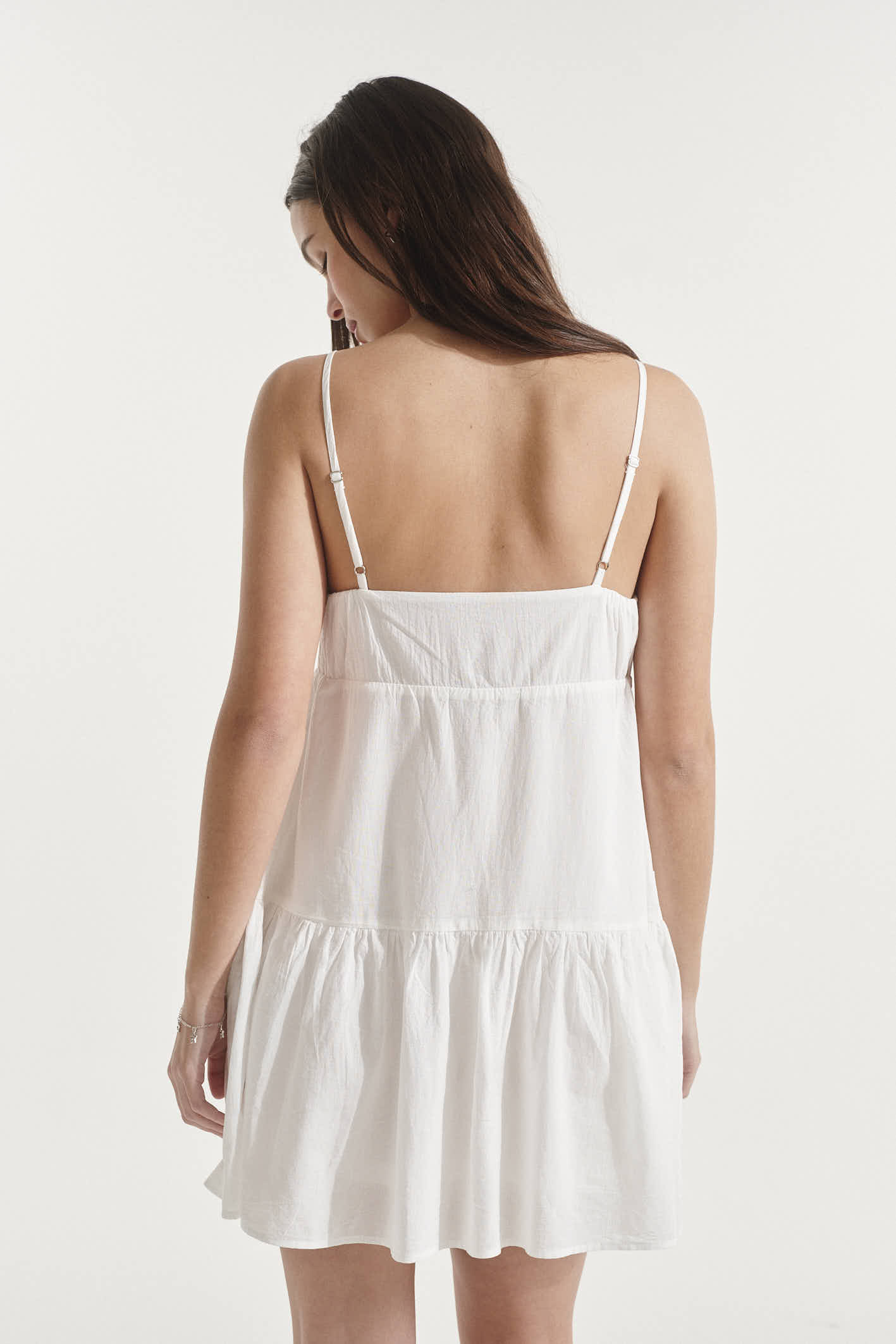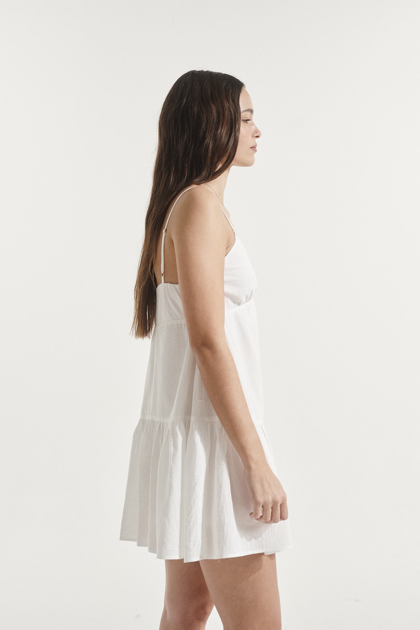 Descubre el VESTIDO PETUNIA, un encantador vestido de bambula forrado, ideal para adolescentes que buscan frescura y estilo en verano. Con tazas en el delantero, volados con frunces y puntilla en el escote, este vestido blanco combina comodidad y elegancia, gracias a sus tirantes regulables y elástico en los laterales.