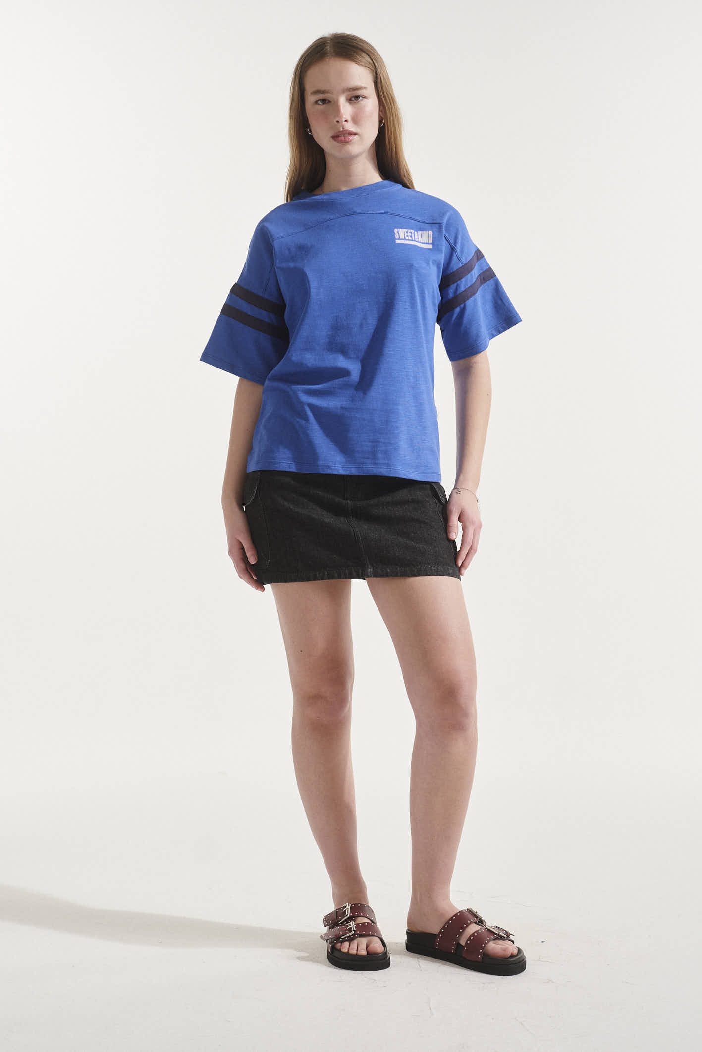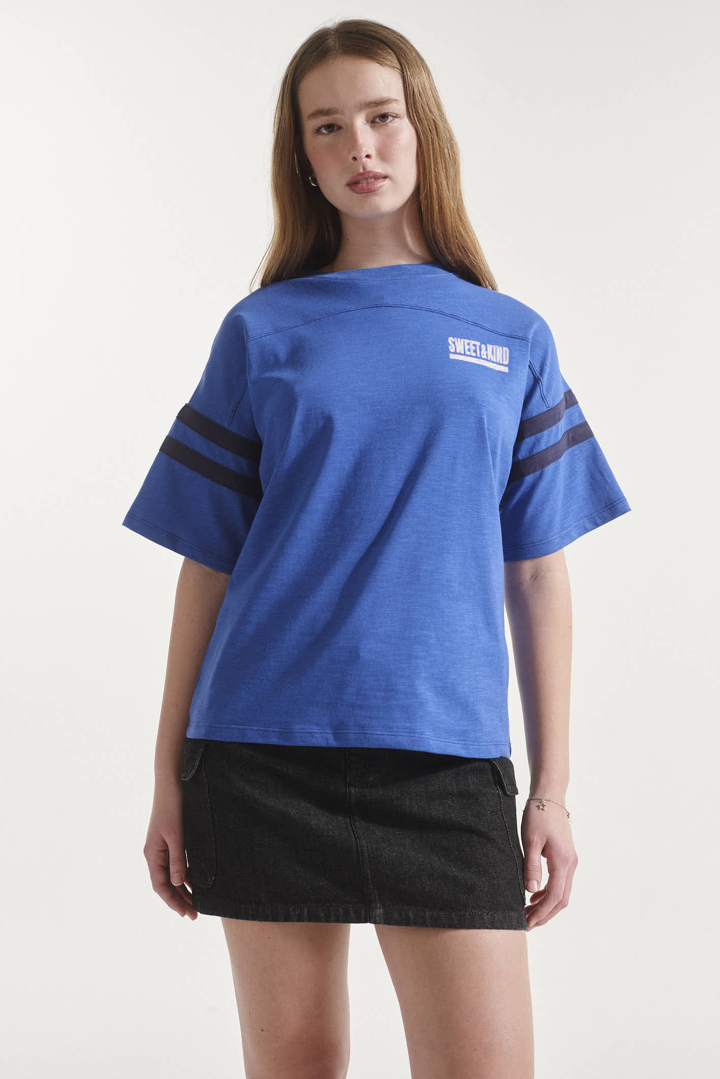 Descubre el REMERON BERRY, una prenda ideal para adolescentes que buscan estilo y comodidad en verano. Con su diseño de manga corta, recortes en el frente y vivos aplicados a contra tono en las mangas, este REMERON de 100% algodón en azul es perfecto para lucir fresco y a la moda.