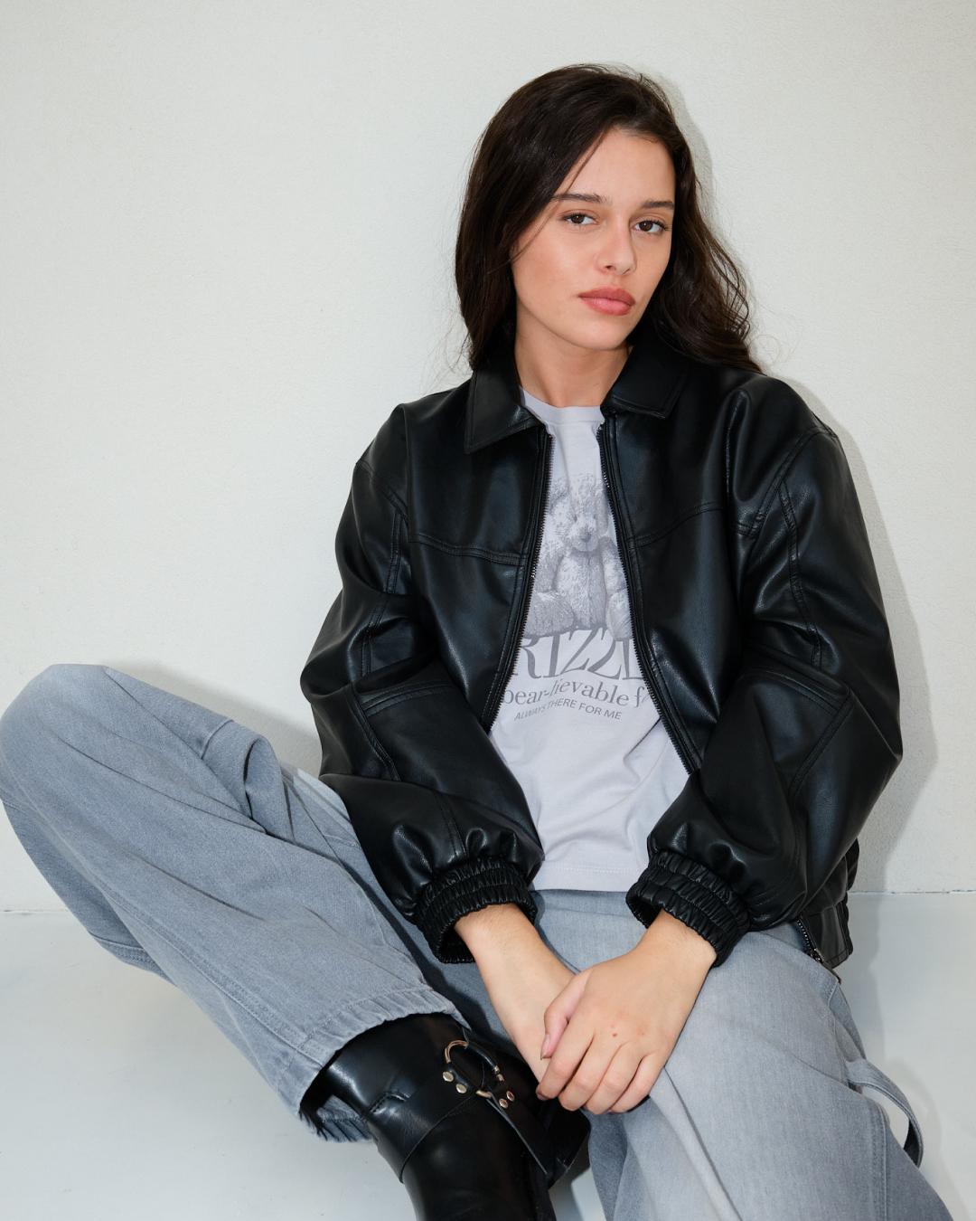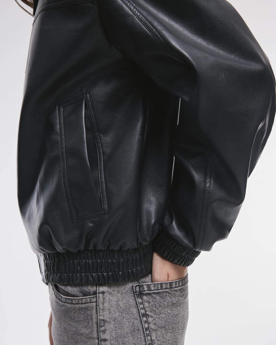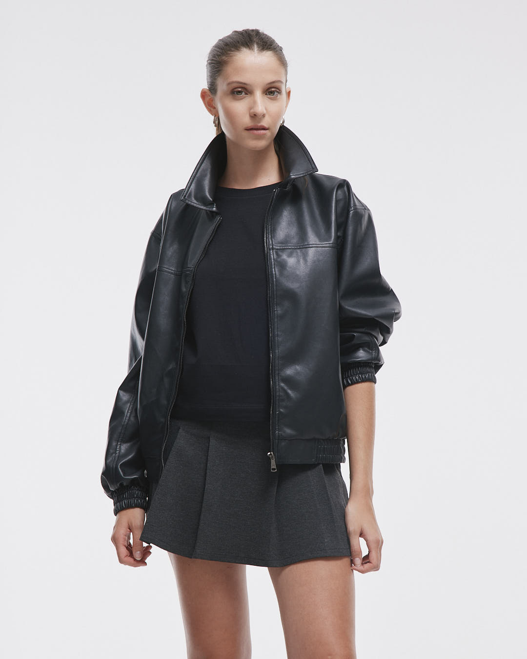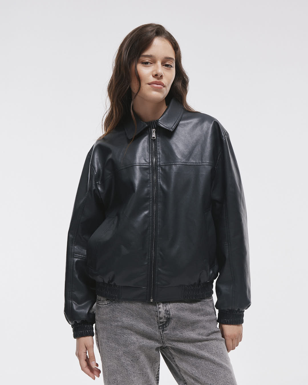 Descubri la Bomber Vilna! Esta bomber de poliuretano negro cuenta con un cierre metálico central y detalles como el elástico en la cintura y puños, además de bolsillos ojales en el frente. Completa tu estilo con el dije metálico que lleva el logo de la marca en la parte trasera.