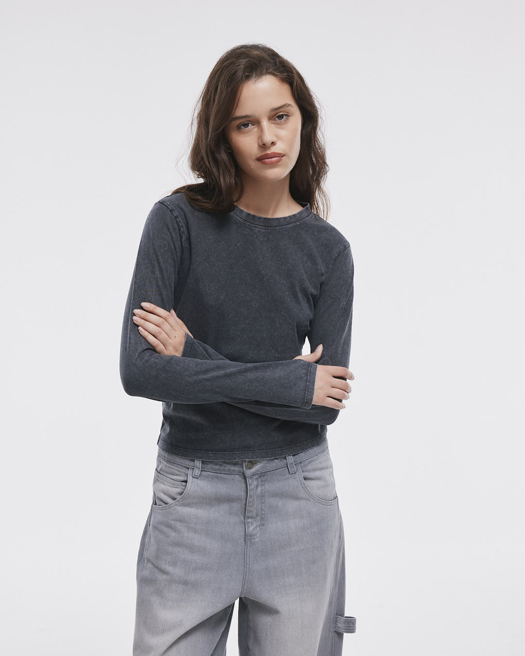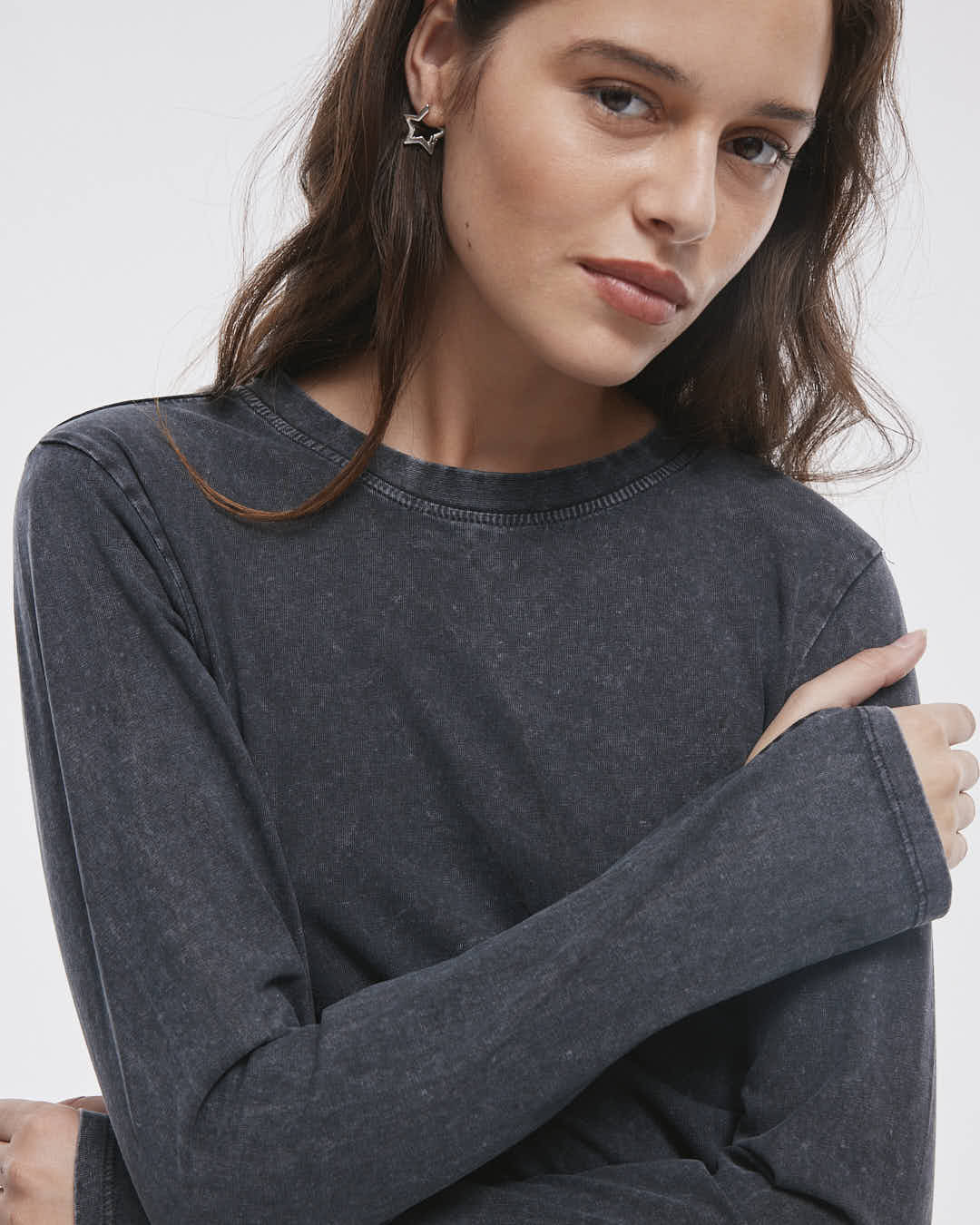 La Remera Bleach, hecha de 100% algodón y con un toque de elastano que se ajusta a tu cuerpo. Con sus mangas largas y aberturas para pasar los dedos, además de un pigmentado y efecto láser únicos.