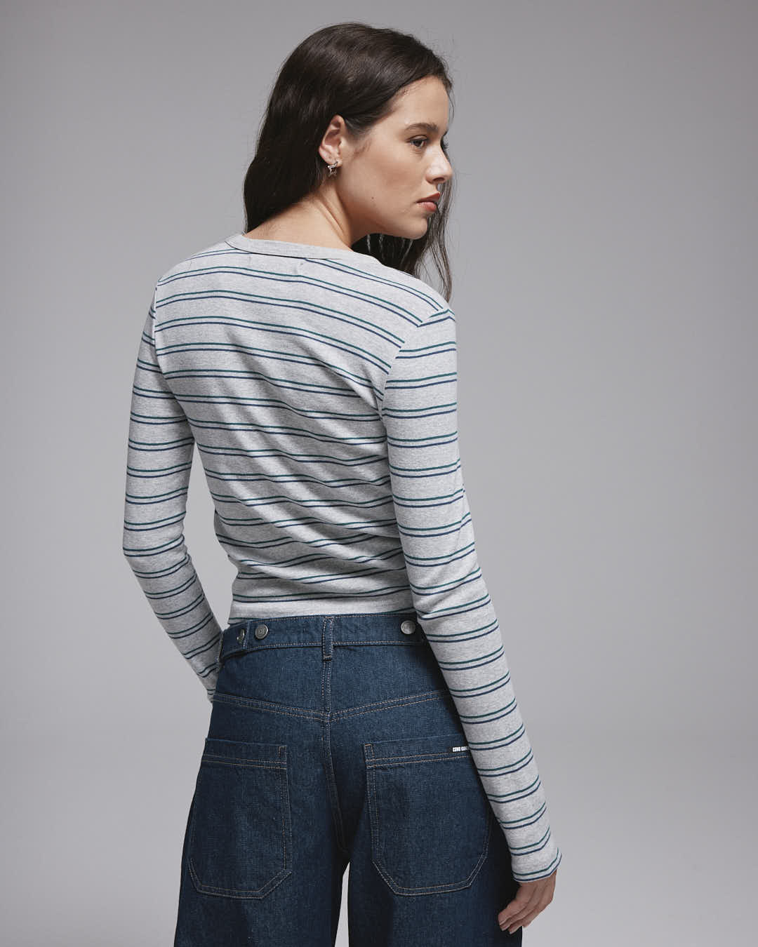 La Remera Gala, confeccionada en 100% algodón, esta remera de manga larga con ribb rayado y abertura en la manga para pasar el dedo se ajusta al cuerpo, brindando un outfit moderno.