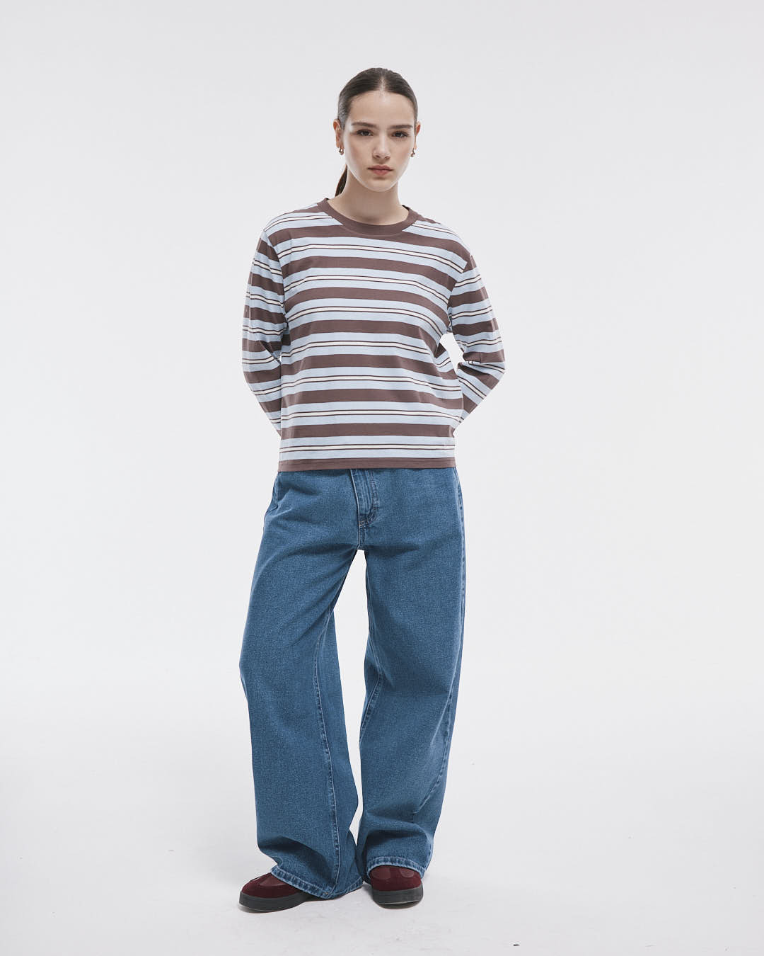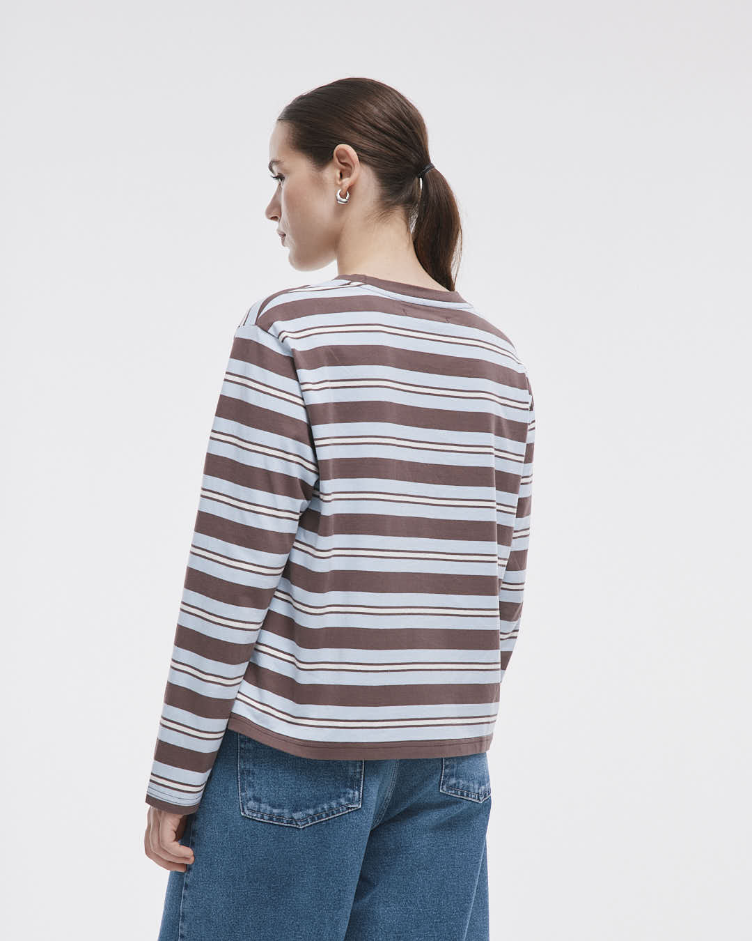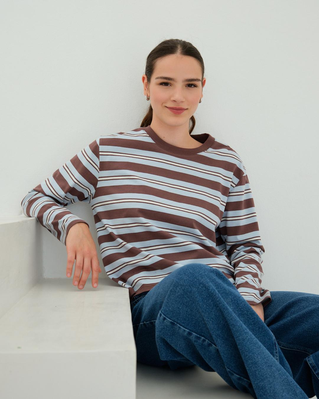 La Remera Lara: hecha de 100% algodón, esta remera de manga larga con un diseño de jersey rayado y cuello de ribb liso te ofrece un calce holgado y cómodo. Ideal para lucir en cualquier ocasión.