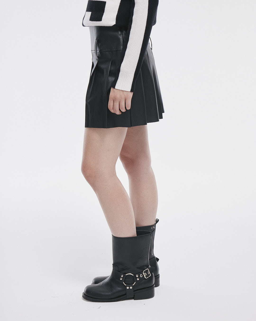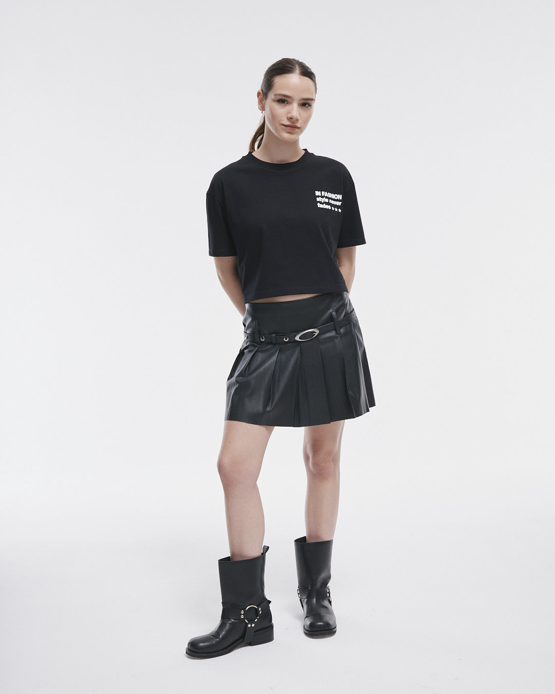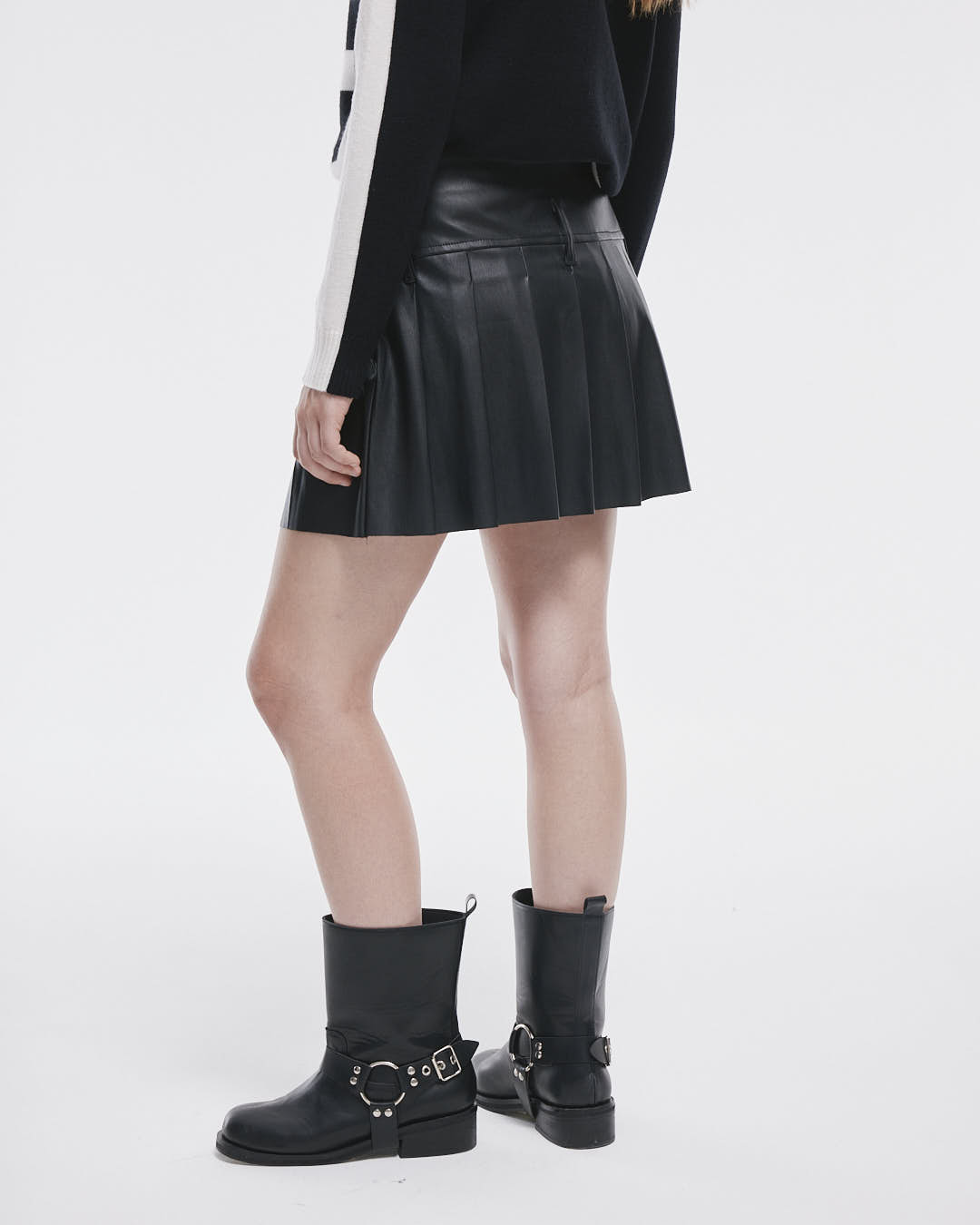 La Pollera Danna es la prenda perfecta para lucir con estilo y comodidad. Con su diseño de pu con tablas, presillas en el delantero y trasero, y un práctico cierre lateral.