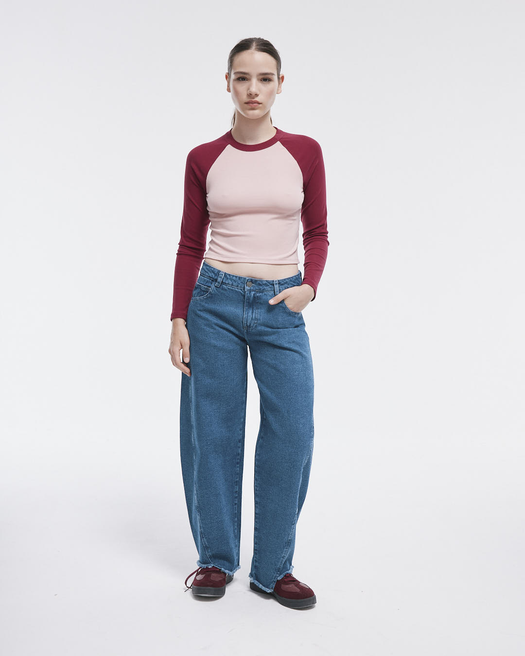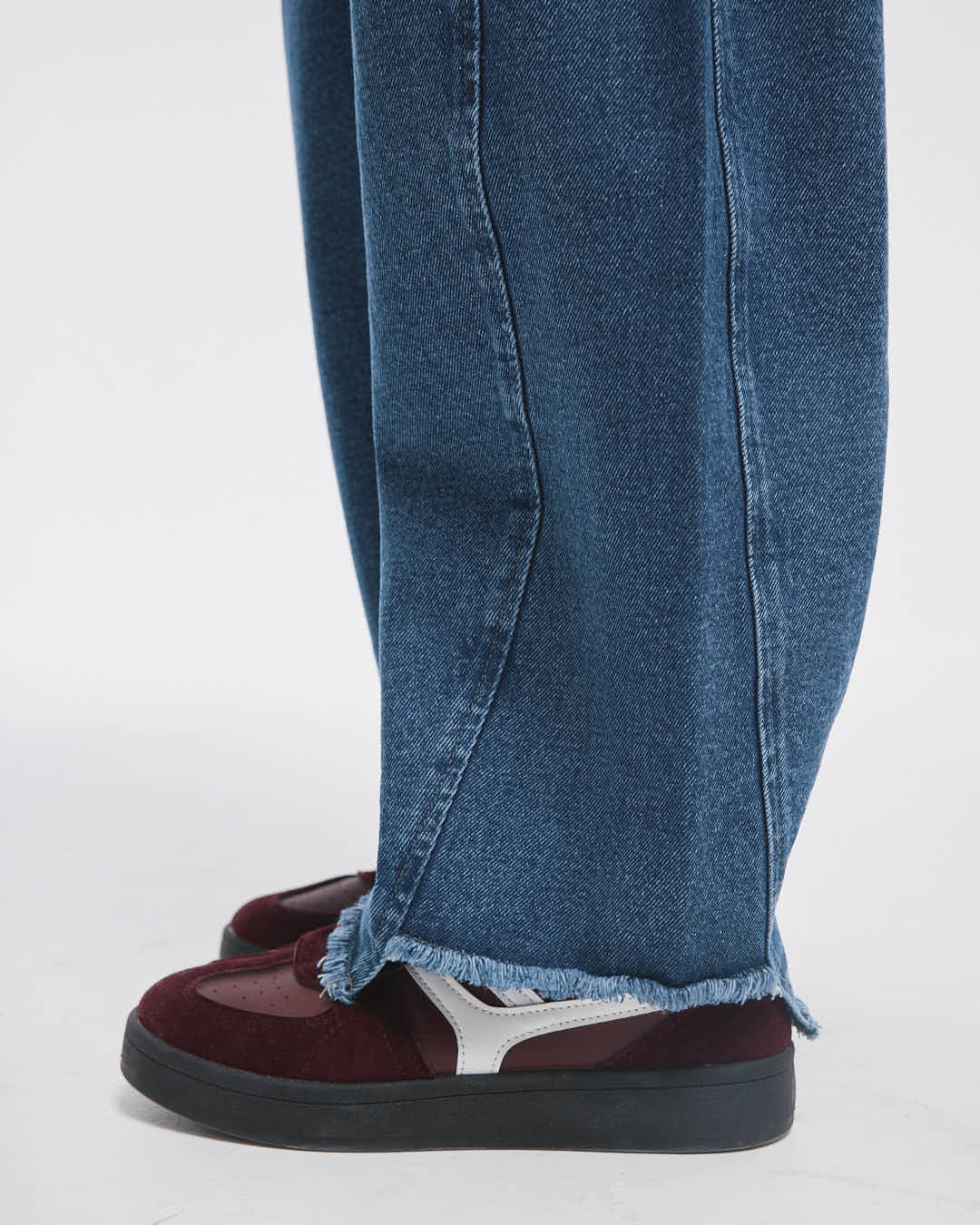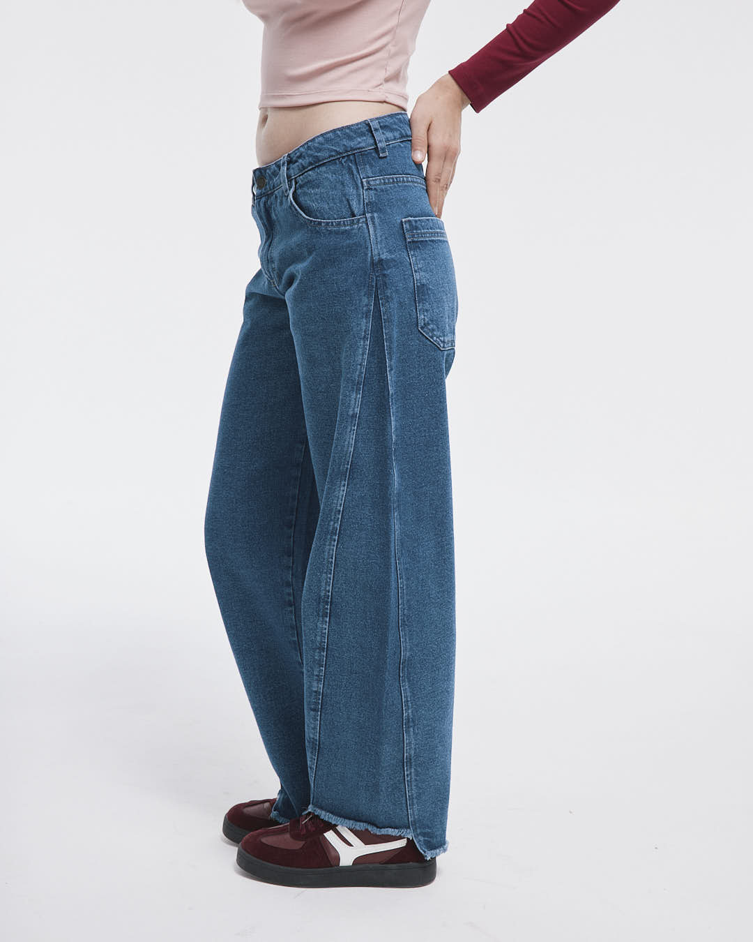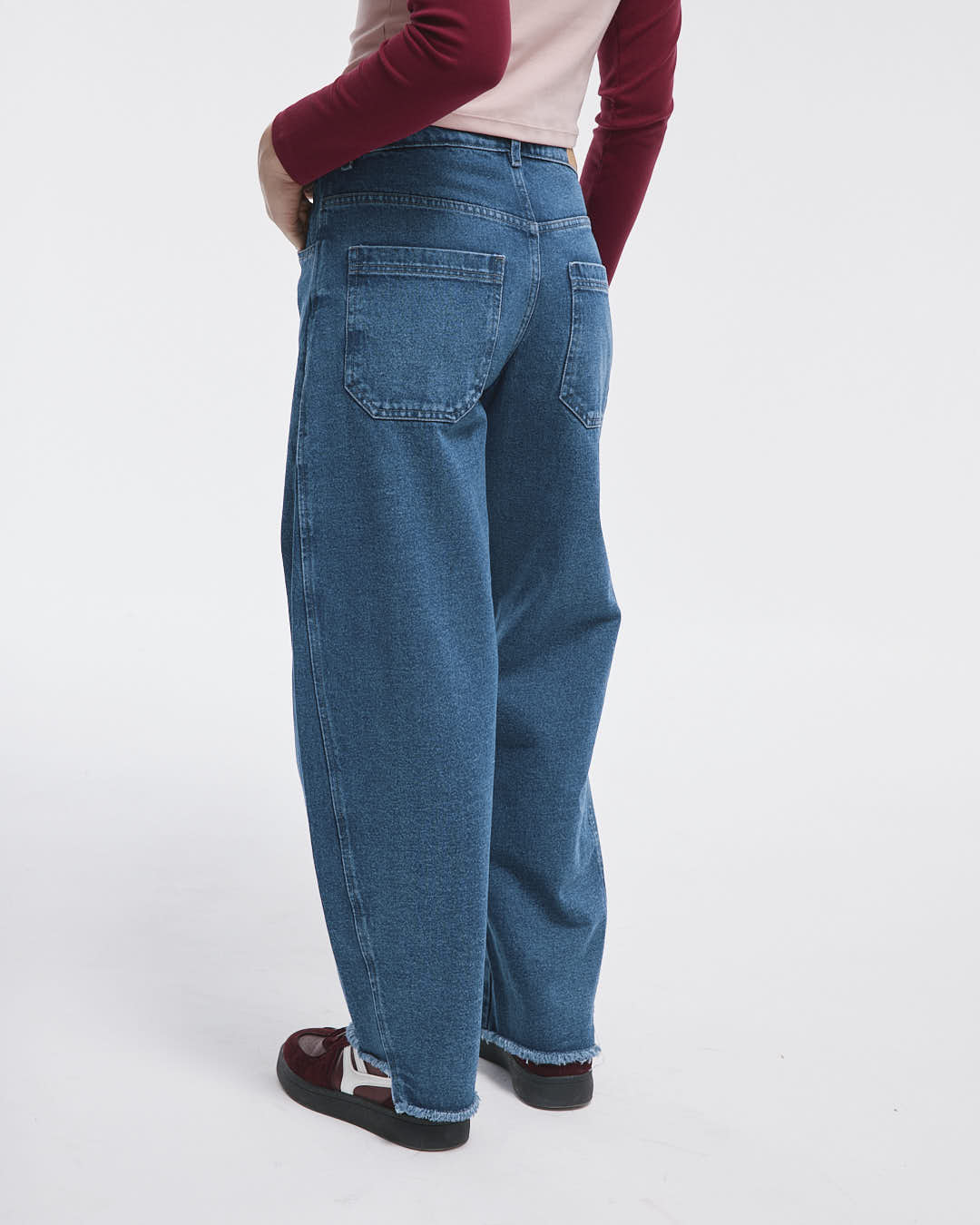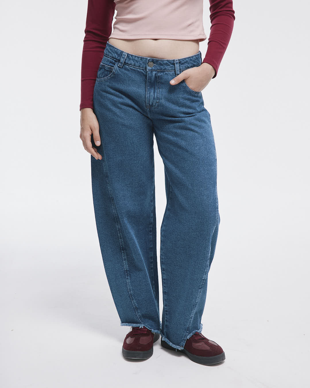 Jean Avila, pantalón de 5 bolsillos, hecho 100% algodón, presenta un calce barrel y recortes laterales con diferentes largos que le dan un toque único y moderno.